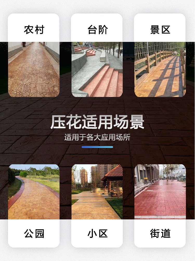 ●压花地坪防油、防水、防滑,表面不会开裂、脱落、褪色。