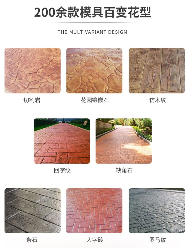 一改混凝土表面的灰暗,冷漠,呈现出的效果酷似天然的花岗岩,大理石,火山岩,青石板,木板及砖石等等,行业中也称之为地坪界的百变王