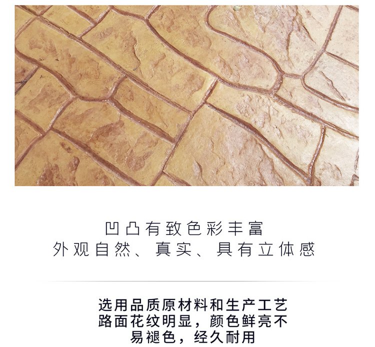 压花地坪路面的特点就是它能够刻意地表现出自然材质的粗砺,凸凹不平和复杂的纹理,也可以平整如水,光亮如镜,无限的色彩组合及模具选择使设计师的想象力得以任意驰骋