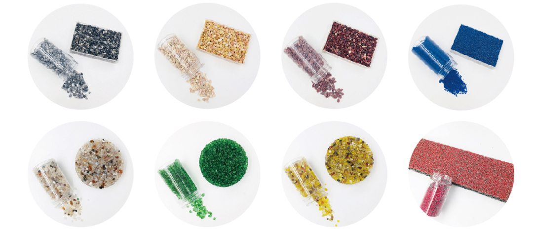 固迈胶粘石透水路面,采用固迈⑧LMJ201专用耐候胶黏剂与天然彩石、陶瓷颗粒、玻璃珠、彩砂等高级装饰性骨料搅拌摊铺于透水混凝土、普通混凝土及沥青等结构层之上的高档装饰型透水路面。具有美观、耐久、强固、免维护、防滑、铺装灵活的特点,可根据创意铺设标志性图案或个性化图形。