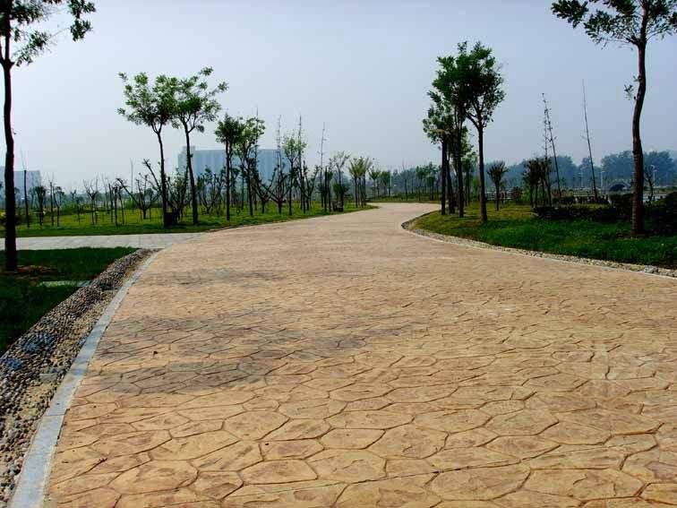 用该硬化剂材料制作的压模地坪具有耐磨、防滑、抗冻、不易起尘、易清洁、高强度、耐冲击、且色彩和款式方面有广泛的选择性、成本低和绿色环保等特点,是目前园林、市政、停车场、公园小道、商业和文化设施领域的理想选择。