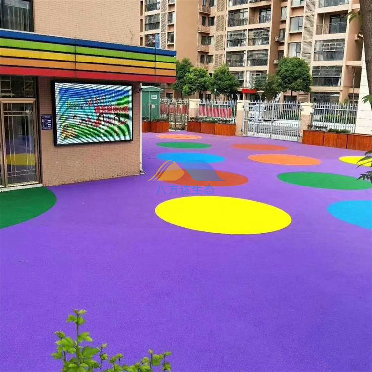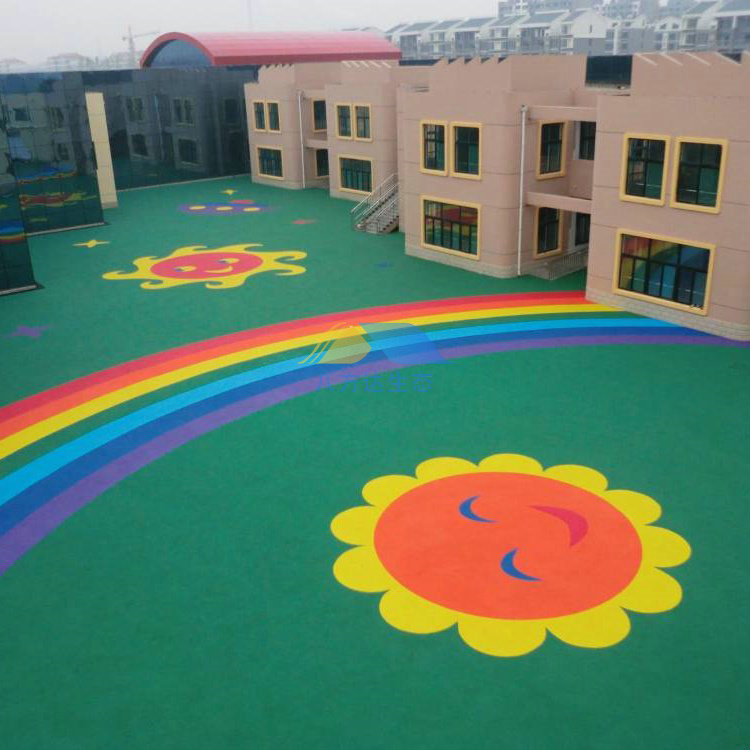 Epdm橡胶颗粒地坪选材为水性原料,无毒,绿色环保产品,质感Q软回弹性强,使用安全,图案设计感强,耐候性高,不宜老化,使用寿命长,抗紫外线强,色彩多样,性价比高价格适宜是现在幼儿园园区使用较多的地坪之一。